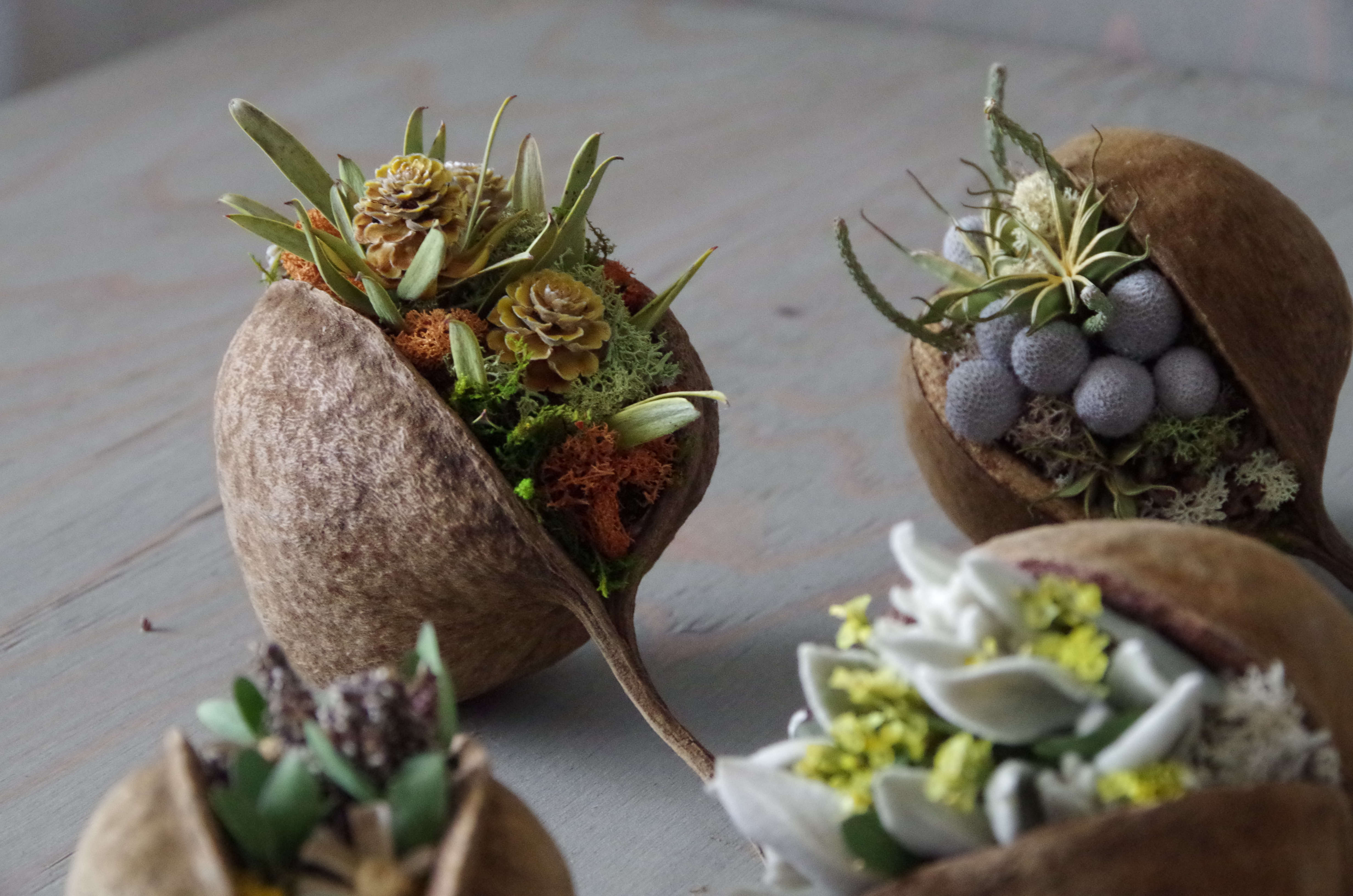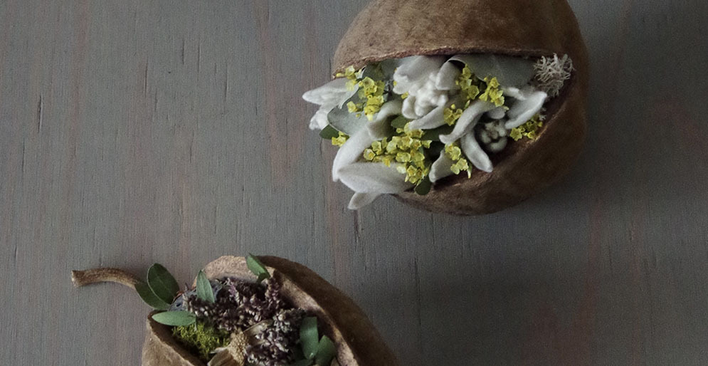 庭植物から受けるインスピレーションを大切にドライフラワーをメインにした花飾りを制作。